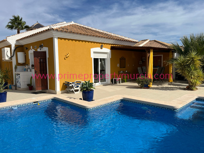 THIS BEAUTIFULLY PRESENTED 2 BEDROOM 1 BATHROOM DETACHED AND EXTENDED ANTOJO STYLE VILLA IS SITUATED ON A WEST FACING PLOT OF 315m2 WITH VIEWS OF THE SURROUNDING MOUNTAINS AT THE SOUGHT AFTER MAZARRON COUNTRY CLUB, MURCIA. THE PROPERTY HAS A MODERN FREE-FORM SWIMMING POOL, COVERED TERRACE, SPACIOUS STORAGE ROOM, LIVING AREA WITH SEPARATE DINING SPACE, FITTED KITCHEN AND DUCTED HOT + COLD AIR-CONDITIONING.
